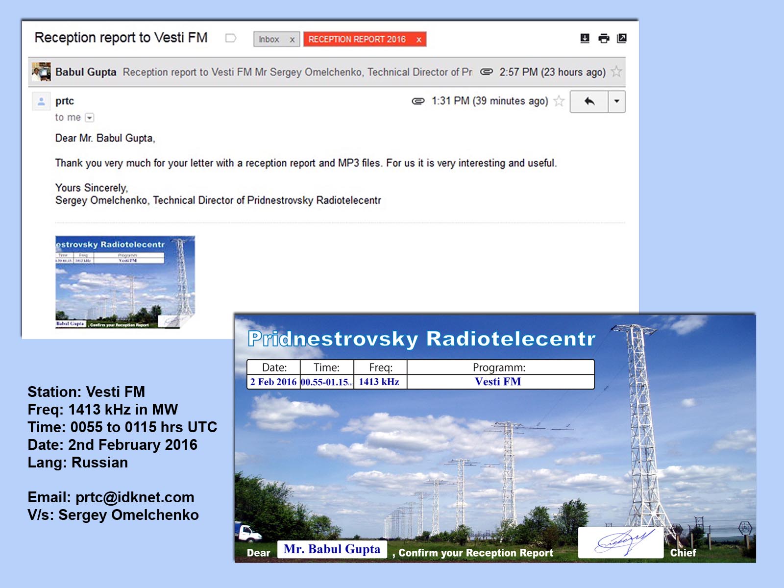 Babcock via Kishnev Grigoriopal, Pridnestrovie: 9425 kHz in Farsi at 0255 hrs to 0330 hrs UTC log this station on 2nd August, 2015 and f/d eQSL card received on 3rd August, 2015 for my email report to: prtc@idknet.com v/s Sergey Omelchenko (Techical Director of Priduestrovskiy Radiotelesentr.)